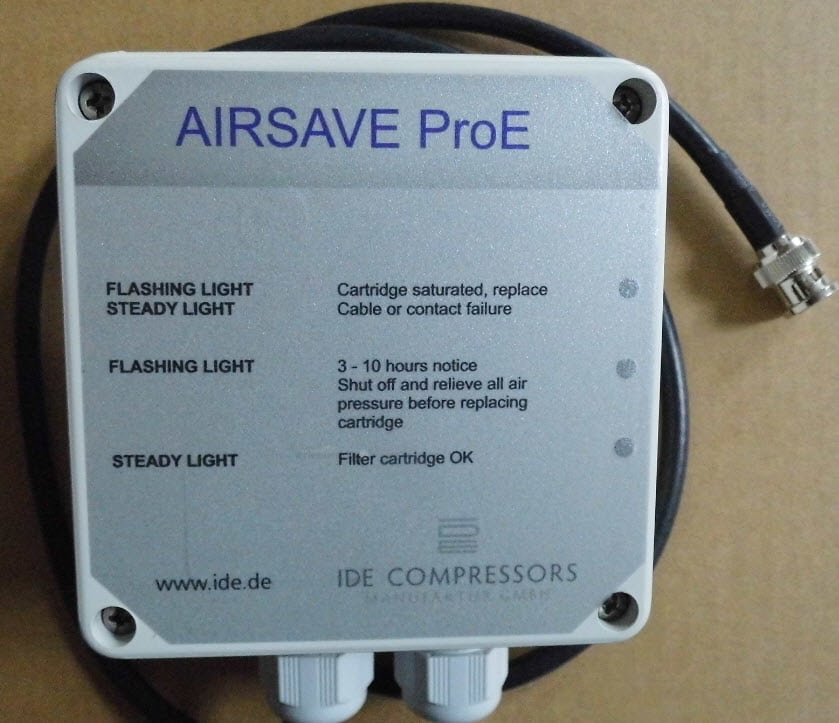 Airsave Pro Eco, in das Trocknersystem integriertes elektronisches Messsystem für präzise Trocknersättigungsüberwachung, das den Sättigungsgrad der Trocknerpatronen permanent mittels Sensoren misst und überwacht. Mit bei einer gemessenen Sättigung von 80 % erfolgt eine Vorwarnung für bevorstehende Abschaltung zur Patronenbestellung und Abschaltung bei vollständiger Sättigung der Patronen.