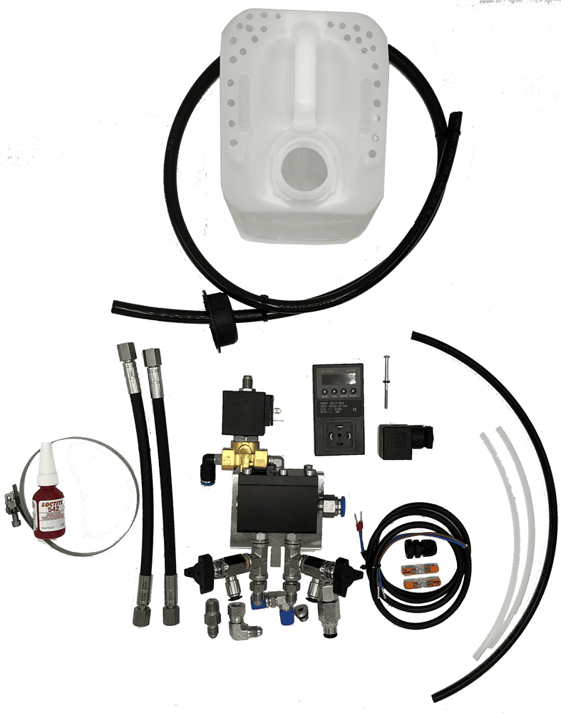 Consisting of: pneumatic valves with piston and control diaphragm, 2x connection screw fitting 6 x1/4 + 6S x1/8, 2 straight screw-in connectors 6S x 1/8 connection plug-in angle 8S x 1/8, 2/3 solenoid valve 230V 50Hz, with silencer 1/4″, electronic timer, pre-bent stainless steel pipes for connecting the two separators, connection hose for control pressure, plug-in coupling with low-pressure hose 12 mm and