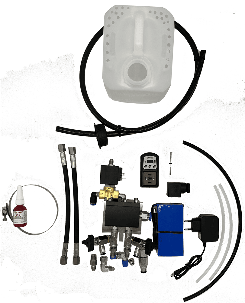 Bestehend aus: pneumatischen Ventilen mit Kolben und Steuermembrane, 2x Anschlussverschraubung 6 x1/4 + 6S x1/8, 2 Gerade Einschrauber 6S x 1/8  Anschluß-Steckwinkel 8S x 1/8, 2/3 Magnetventil 12V 14W DC mit Schalldämpfer 1/4″, elektronischer Timer, Edelstahlrohre vorgebogen zum Anschluss der beiden Abscheider, Anschlussschlauch für Steuerdruck, Schnellkupplung GEKO mitNiederdruckschlauch 1/2″ 50 CM,