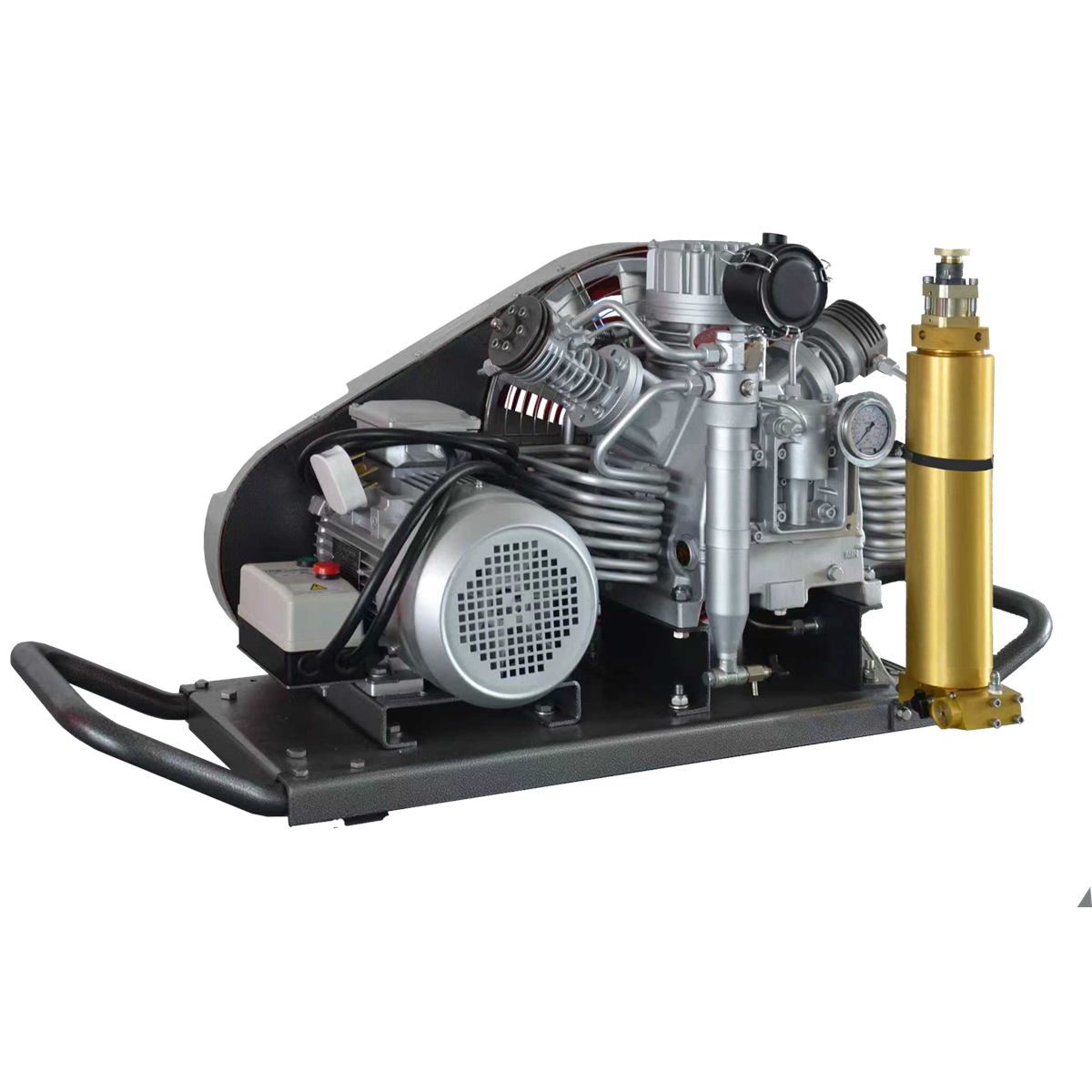 3-stufiger Kompressorblock, jede Stufe mit Sicherheitsventil. Speziell gehohnte Graugusszylinder, Aluminium-Kolben mit Spezialkolbenringen, Freiflugkolben in letzter Kompressionsstufe, Niederdruck-Ölpumpe mit Ölfilter für sichere Schmierung, Micronic- Ansaugfilter, Enddruckmanometer, Druckhalteventil, Rückschlagventil,